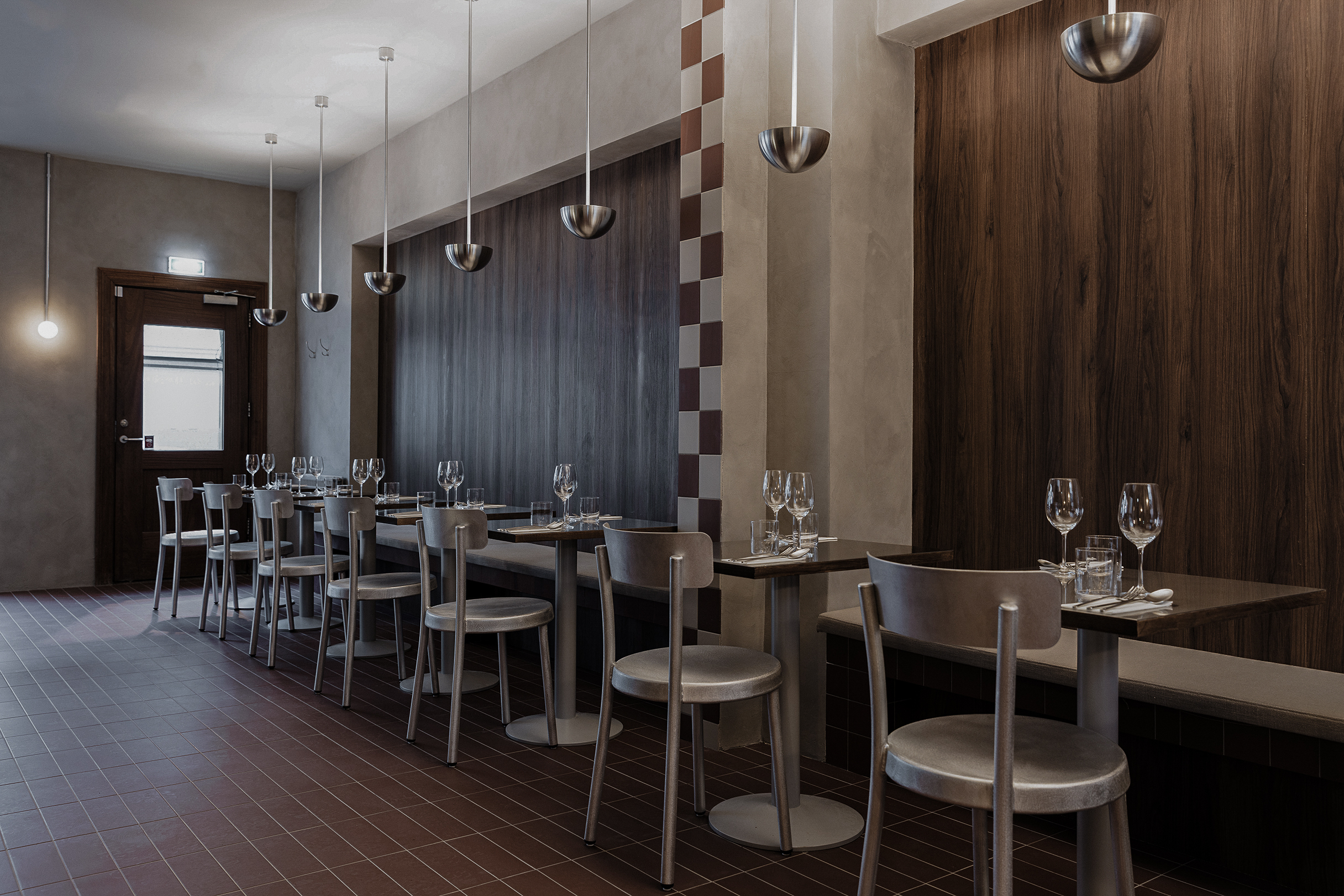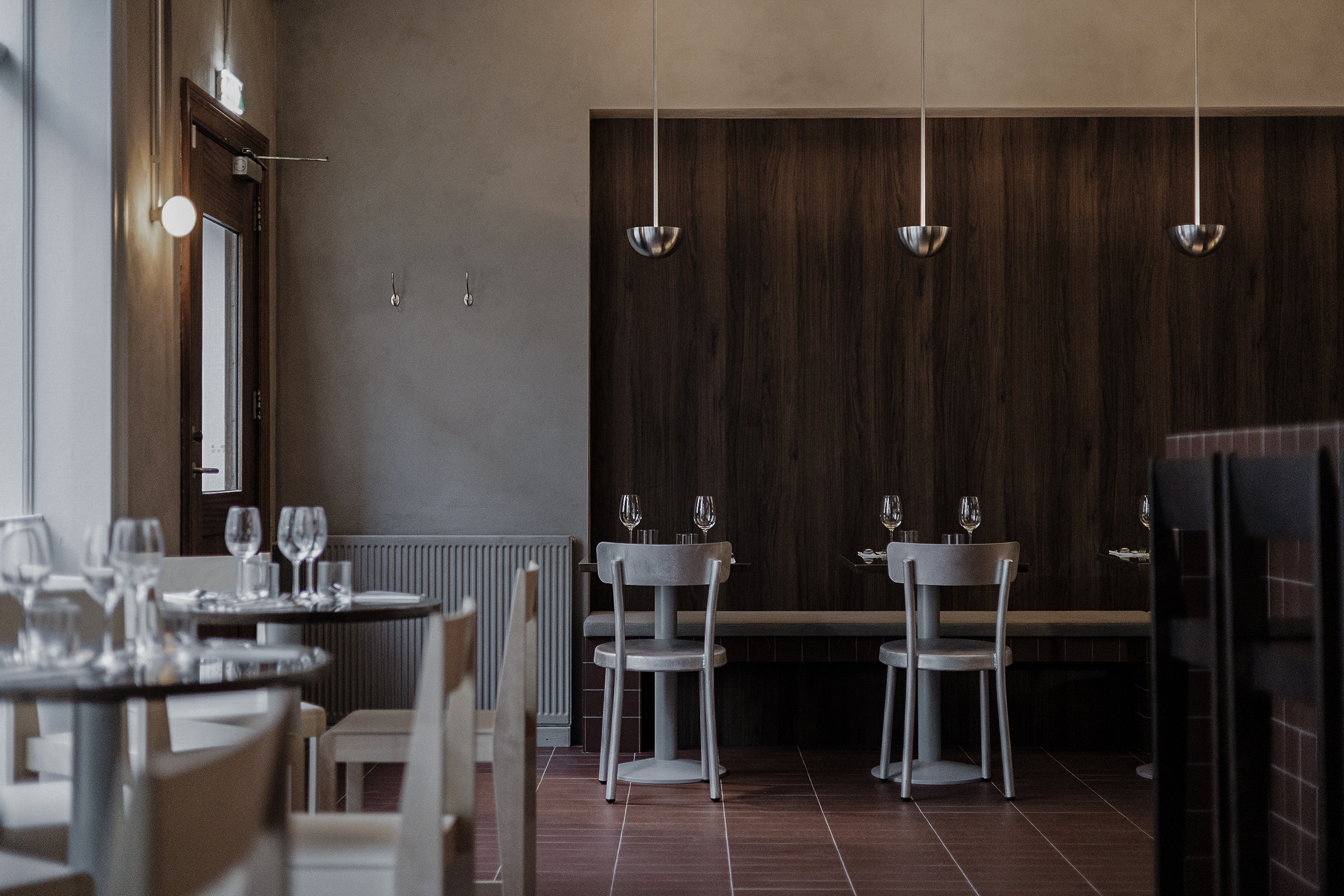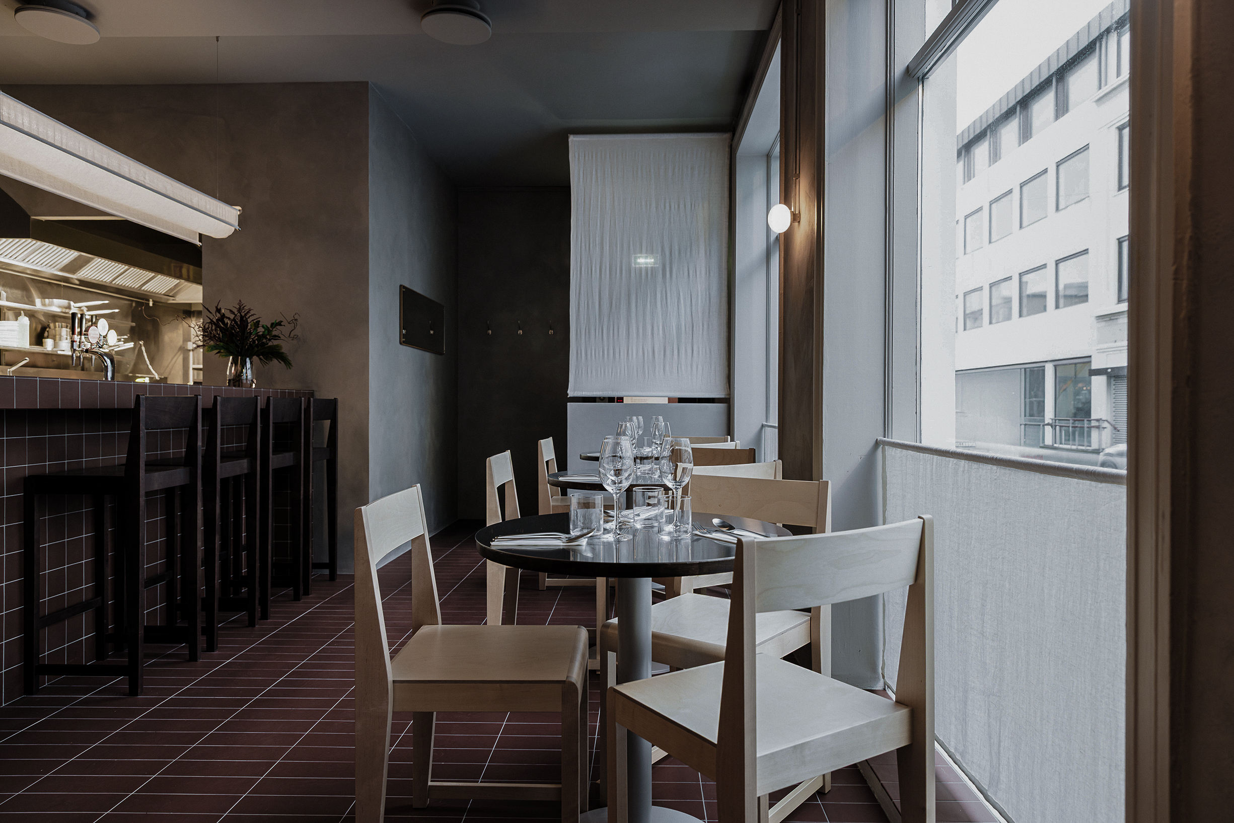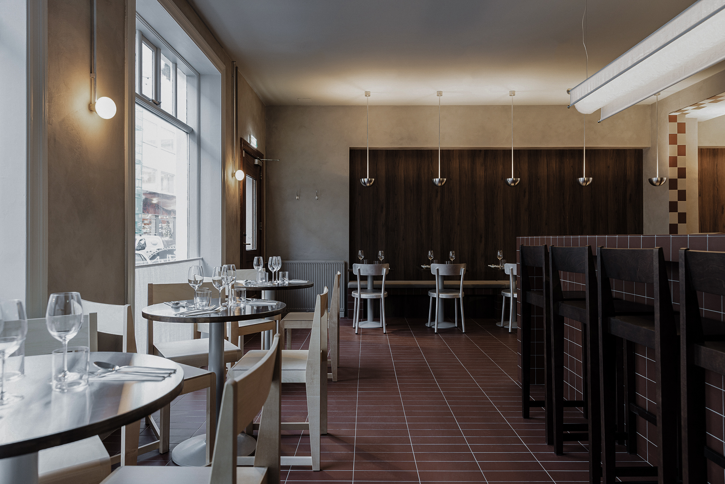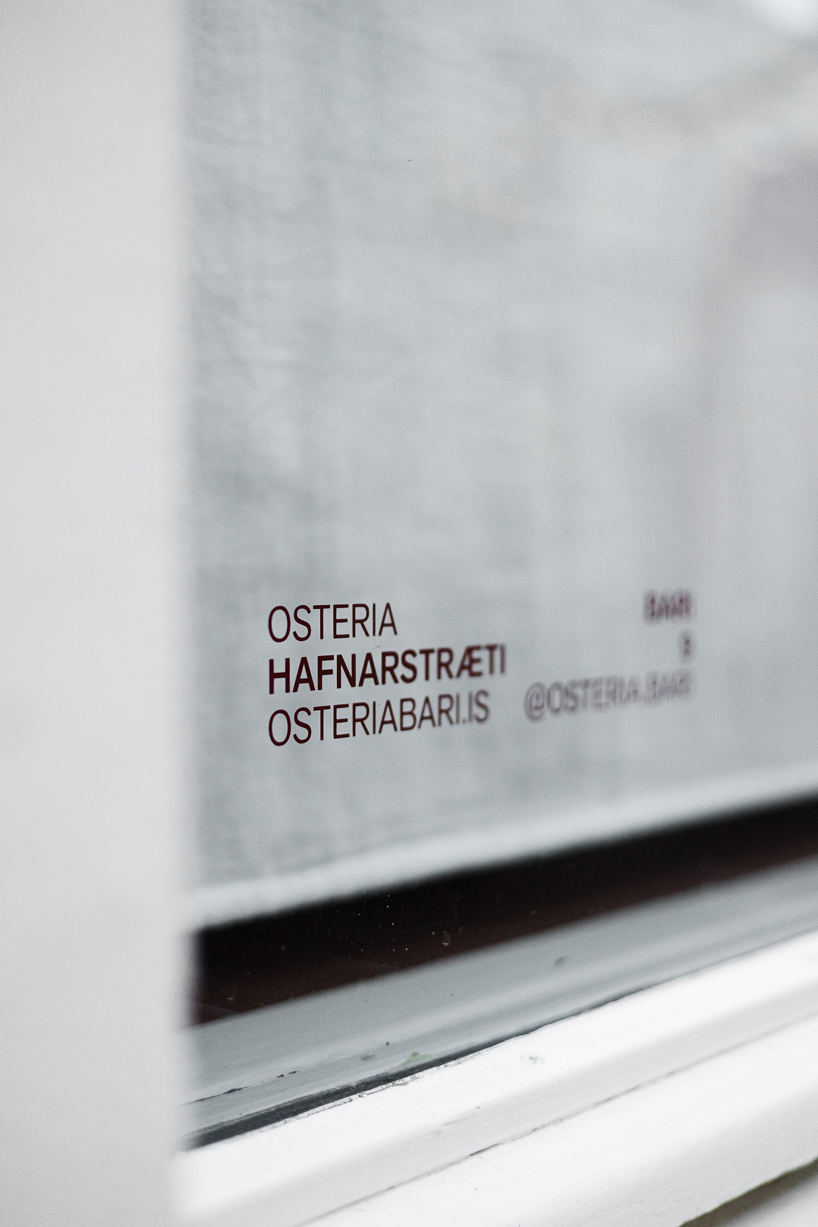 Osteria Bari is a restaurant and wine bar located in downtown Reykjavík, opening in December 2025. Aron Freyr and I developed the project in its entirety at Sítrus, designing everything from the branding to the interior concept. Drawing inspiration from the warmth, simplicity, and convivial atmosphere of traditional Italian osterias, the space is furnished with chairs and wall lights by FRAMA, while the pendant lighting above the dining tables was developed in collaboration with Casegoods. A custom-sized pendant light above the bar was designed by Caia Leifsdotter. The material palette combines burgundy tiles from TopCer with walnut paneling, steel, and linen, creating a rich yet understated environment that balances warmth and durability.
